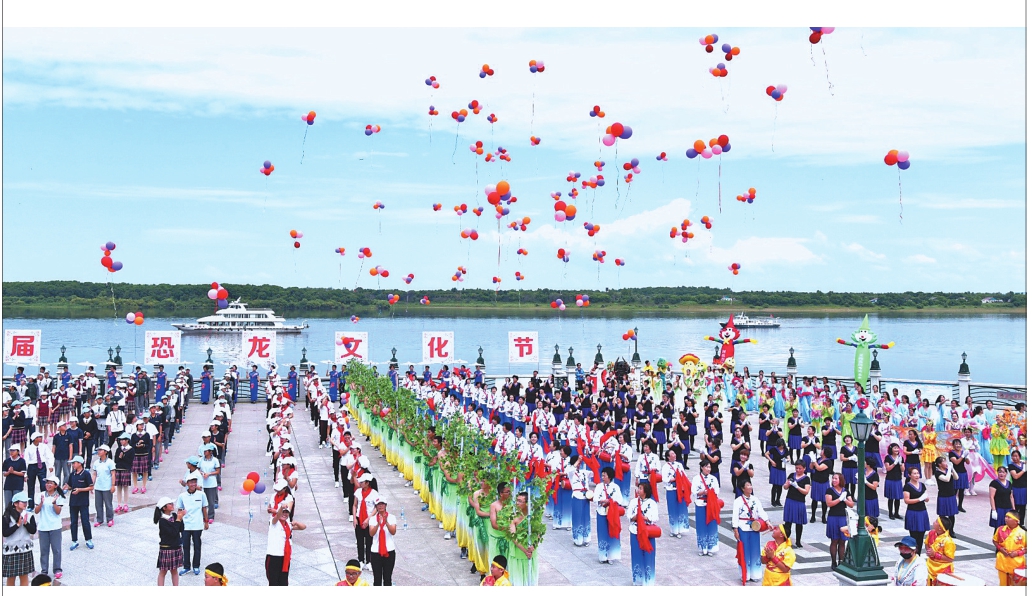 6月30日,中国·嘉荫第二届恐龙文化节开幕,“龙韵龙味”“龙情龙趣”“龙乡龙景”三大板块贯穿全年旅游季节。 鼓舞《中国龙》拉开开幕式序幕,生态之美、界江之恋、文化之魂、地域之韵4个篇章的巡游表演让观众流连忘返。花车巡游表演中有集恐龙文化、生态资源、冰雪旅游等多种元素于一体的恐龙花车,充满地域特色的鄂伦春、俄罗斯特色服饰队、群众文化展示队和民生成果展示队等18支巡游队伍。伴随着《美丽的嘉荫等你来》的歌声,数千人齐跳健身操,彩色气球漫天飞舞把活动推向了高潮。 本报记者马少忠摄