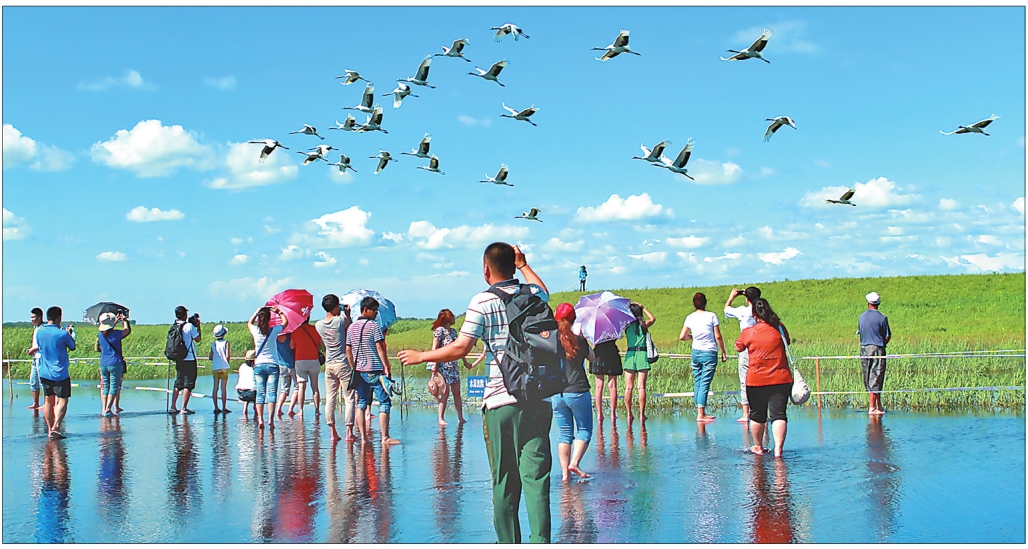 海内外游客在风景秀丽的扎龙国家级自然保护区观赏美丽的丹顶鹤。 张亮本报记者姚建平摄