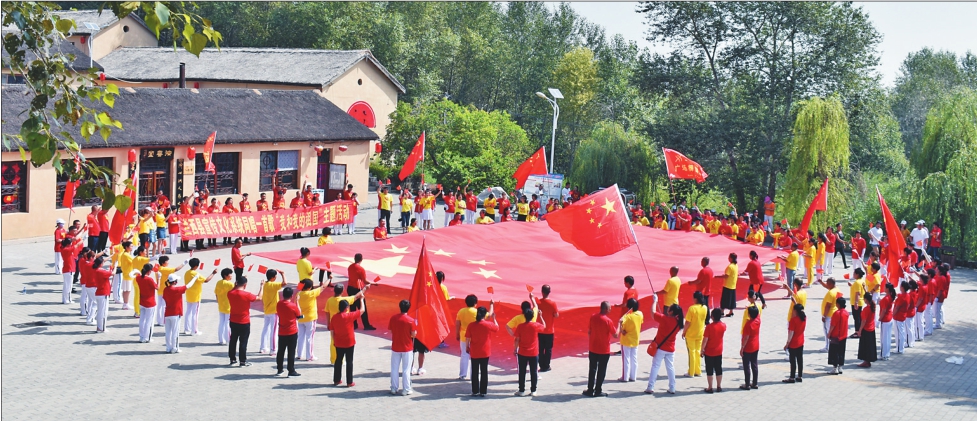 “我和我的祖国,一刻也不能分割……”在乔家大院门前、德善第一村、景观大道、民俗展馆门口等多个地点,伴随着熟悉的旋律响起,党员干部们或围成数字“70”的形状,或围绕在巨幅国旗旁,挥舞着国旗、扇子纵情高歌,表达对祖国母亲和家乡的诚挚情感。