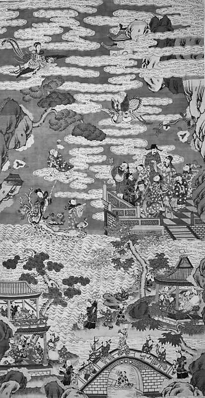 缂丝群仙祝寿图,清,纵171厘米、横89厘米。 图中天上云海缭绕、仙山楼阁,西王母乘鸾凤而来,南极仙翁手捧寿桃乘仙鹤亲迎;在其左下方东方朔腾云驾雾而来,仰头望向上方西王母和南极仙翁;再下方左侧有一槎,一鹤立于槎尾,旁边一仙人双手捧着寿礼,麻姑站于槎尾摇橹划船,高高翘立的槎头上挂着一酒葫芦,槎中间处放着一大大的花篮;右侧瑶台上各持法器的群仙们正抬头仰望上方的西王母和南极仙翁,仙兽梅花鹿间杂其中。天上银河波涛荡漾,从天上流向人间,流过状元桥、苍松翠柏、亭台楼阁、百子戏耍,图中人物服饰飘逸,纹饰吉祥、喜庆。此群仙祝寿图寓意“多福多寿、多子多孙”。 “群仙祝寿”题材一般有两种表现形式,一是由竹、桃、灵芝、水仙和寿石等组成图案;一是由传说中的寿星仙人组成,八仙、寿星和西王母等。 传说西王母寿辰之日在瑶池开蟠桃盛会宴请众神仙,众神仙前往为其祝寿。 八仙:曹国舅、吕洞宾、何仙姑、铁拐李、汉钟离、蓝采和、张果老和韩湘子。 东方朔,西汉时期著名的文学家,在民间神话传说中以长命一万八千岁被奉为寿星,后世常用东方朔偷桃图庆贺帝王寿辰。东方朔偷桃的典故源于以下传说:汉武帝寿辰之日,宫殿前一只黑鸟从天而降,武帝不知其名,问,东方朔答:“此为西王母的坐骑‘青鸾’,王母即将前来为帝祝寿。”果然,顷刻间,西王母携七枚仙桃飘然而至。西王母除自留两枚仙桃外,余五枚献与武帝。帝食后欲留核种植。西王母言:“此桃三千年一生实,中原地薄,种之不生。”又指着东方朔道:“他曾三次偷食我的仙桃。”据此,始有东方朔偷桃之说。 麻姑,道教神话人物,又称寿仙娘娘、虚寂冲应真人。据《神仙传》记载,其为女性,修道于牟州东南姑馀山,中国东汉时应仙人王方平之召降于蔡经家,年十八九,貌美,自谓“已见东海三次变为桑田”,故古时以麻姑喻高寿。又流传有三月三日西王母寿辰,麻姑于绛珠河边以灵芝酿酒祝寿的故事。过去民间为女性祝寿多赠麻姑像,取名“麻姑献寿”。 (黑龙江省博物馆王晓艳)