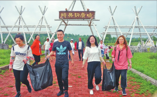 7月21日,旅游者在黑河市爱辉区新生鄂伦春族乡原始部落体验区游览后,带着垃圾返回到出发地博奥韧广场倒入垃圾箱。近年来,黑河市旅游部门加大了旅游景区及旅游者环境保护宣传力度,环保意识深入人心,有效减少旅游业对当地环境产生的破坏。 邱齐龙本报记者李民峰摄