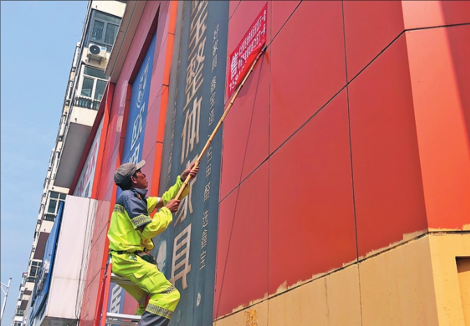 发现城市“牛皮癣”,环卫工人及时清理。 本报记者苏强摄