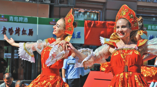 异国风情舞蹈成为中央大街上一道靓丽的风景。 本报记者苏强摄