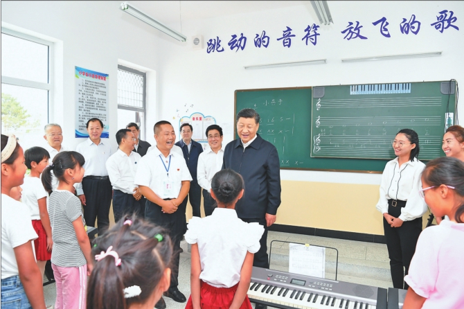 21日上午,习近平在武威市古浪县黄花滩生态移民区富民新村富民小学的音乐教室,认真观看正在进行的音乐课教学。 新华社记者谢环驰摄