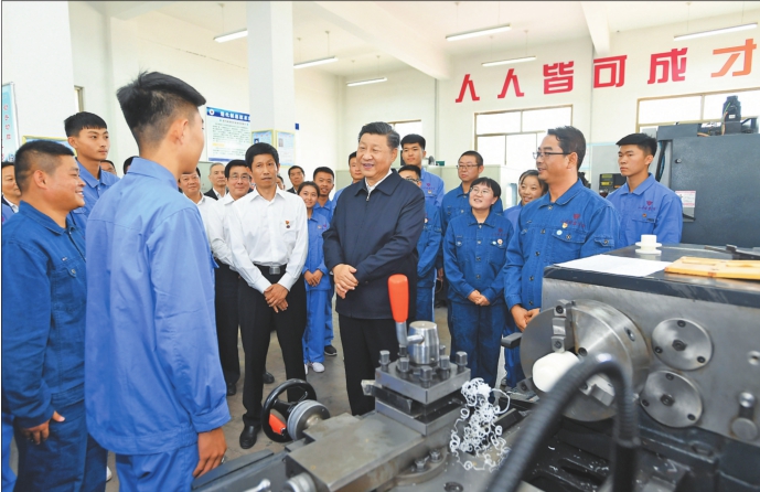 20日下午,习近平在张掖市山丹培黎学校现代制造技术实训室,观看职业技能实训,同师生亲切交流。 新华社记者谢环驰摄