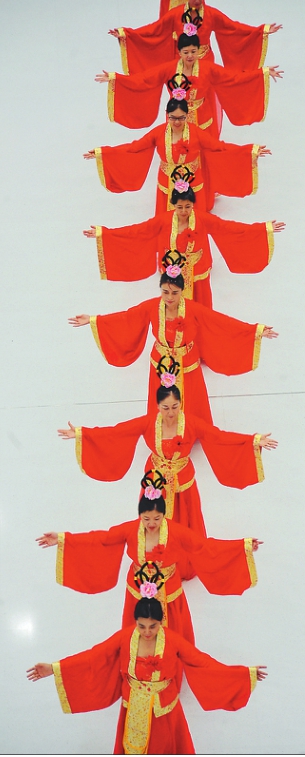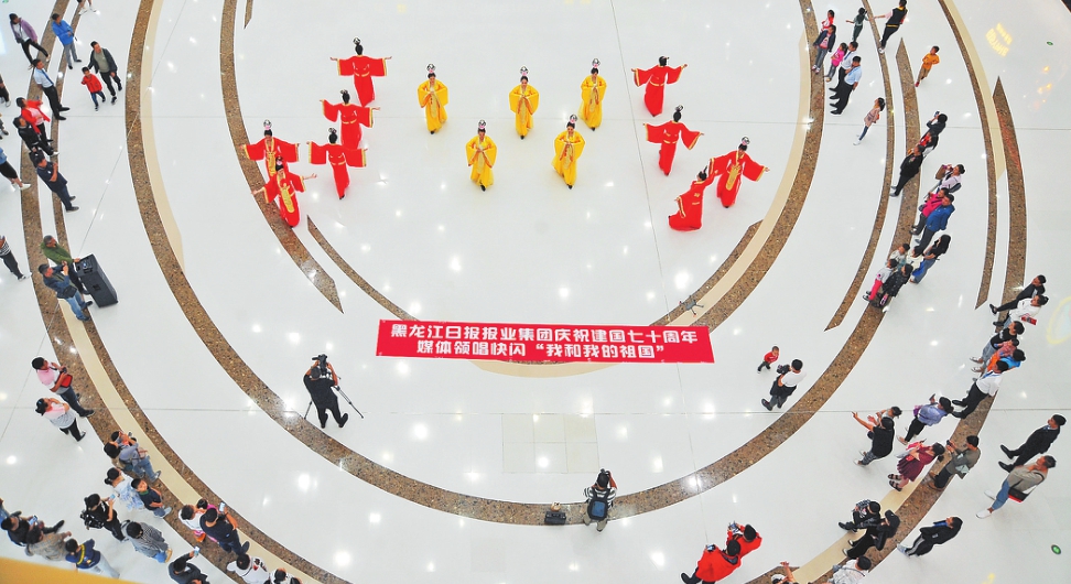 本报22日讯(王晴记者王巍)22日晚,黑龙江日报报业集团庆祝新中国成立70周年“媒体领唱·我和我的祖国”时尚走秀快闪《山河多娇》在哈尔滨新区融创茂内举行。仪态端庄的14名采编人员为广大市民献上了一场红色主题大秀,曼妙多姿的舞姿表达了对祖国的深情祝福。 华灯初上,人头攒动的融创茂里,突然响起悠扬悦耳的音乐声,一群身着华服的表演者从人群中缓缓走来……市民们纷纷停下脚步,驻足欣赏,很多人拿出手机,拍摄照片和视频。来自黑龙江日报报业集团的一线采编人员用深情演绎出对伟大祖国的无限热爱,引起在场观众的强烈共鸣。 据了解,“媒体领唱·我和我的祖国”快闪是黑龙江日报报业集团庆祝新中国成立70周年的系列活动。本次在哈尔滨新区是系列活动的第五场。此前,来自省报集团的采编人员分别在哈尔滨火车站、太阳岛、兆麟公园、哈尔滨西站等地用“快闪”的方式讴歌新时代,祝福伟大祖国。 快闪《山河多娇》现场。 本报记者蒋国红邵国良郭俊峰苏强摄