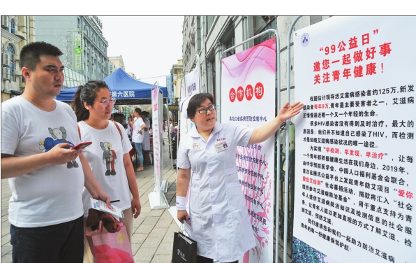 近日,由黑龙江省、哈尔滨市疾病预防控制中心联合主办的“防艾”宣传募捐活动在中央大街举行。捐款将汇入“社会组织参与艾滋病防治基金”,用于重点支持为青年人提供艾滋病防治知识及检测信息的社会服务。 本报记者苏强摄