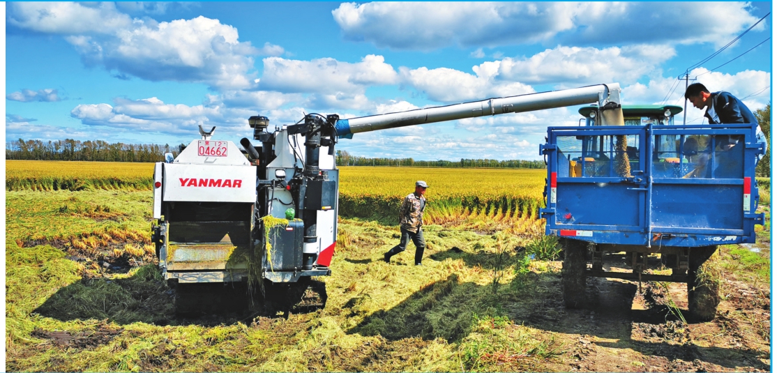 10日10时,北大荒农垦集团总公司江川农场有限公司第四作业站职工王洪江,驾驶着收割机来到自家130亩成熟的稻田里,开始收获水稻,喜开北大荒水稻收获“第一镰”。 张雷本报记者吴树江刘楠摄