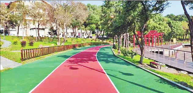 佳木斯市城管局园林部门积极推进“四项工程”,促进园林绿化高质量发展,通过城市公园提档升级,有效助推了营商环境的改善提高,抢抓工期向新中国成立70周年献礼。这是四丰山景区铺设完成的陶瓷颗粒彩色地坪。 本报记者刘亿服