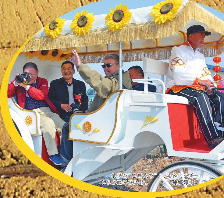 俄罗斯“巴斯克节”上,游客们坐着马车体验异域风情。 孙婷婷摄