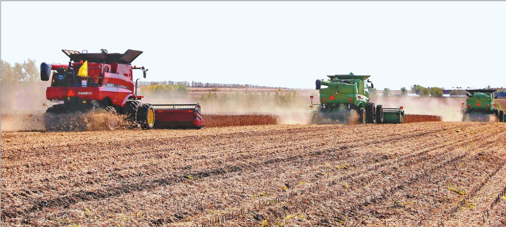今年,垦区在国家惠农政策支持下,大豆种植面积回升到1000多万亩,比上年增加200万多亩。眼下,随着大豆陆续进入成熟期,广大种植户抓住晴好天气,集中机械力量抢收大豆,确保颗粒归仓。
