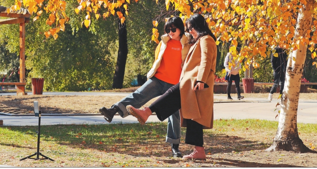 市民在哈尔滨太阳岛上赏秋留影。 本报记者张澍摄