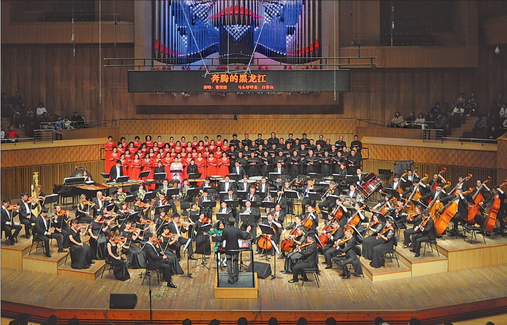 本报22日讯(记者董盈)22日,由省委宣传部、省文联主办,省音乐家协会承办的“风展红旗如画”——庆祝新中国成立70周年“龙歌”交响合唱音乐会在哈尔滨音乐厅奏响,艺术家们用音乐讴歌黑龙江的壮美风光和民族风情,抒发对党、对祖国、对家乡的热爱。 音乐会由哈尔滨交响乐团担任演奏,哈尔滨音乐厅合唱团和哈尔滨市童声合唱艺术团担任合唱。音乐会分为六部分,由《走上这高高的兴安岭》《鄂伦春小调》《乌苏里船歌》三首歌曲改编而成的器乐与合唱《奔腾的黑龙江》拉开了序幕。第一乐章《英雄叙事曲》由《月牙五更》《松花江上》《嫂子颂》《毛主席的话儿记心上》《革命人永远是年轻》五首作品改编而成,让观众们仿佛回到了那红旗漫卷的岁月;第二乐章《多情的土地》和第三乐章《美好的生活》,用《我的黑土地》《满怀深情望北京》《北大荒人的歌》《太阳岛上》《好儿郎》等八首歌曲表达了对黑土地的深情挚爱和对美好生活的赞美;第四乐章《放歌新时代》,观众在《红旗颂》《红星歌》《我在黑龙江等你》等歌曲中回望红色历史,展望美好未来。音乐会尾声,全场起立,共唱《我和我的祖国》,在热烈的掌声和嘹亮的歌声中,整场音乐会落下帷幕。 演出现场。 本报记者邵国良摄