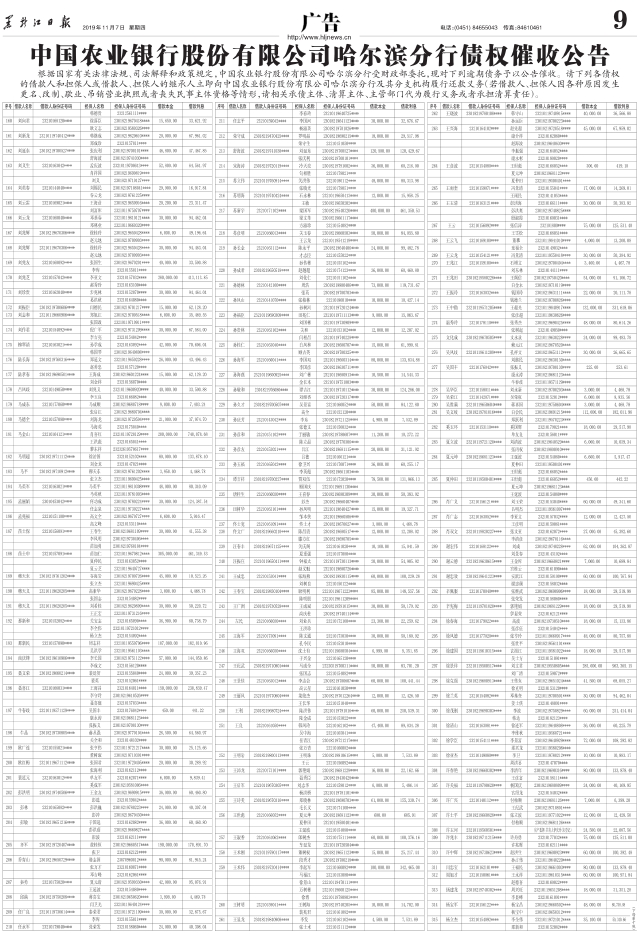 中国农业银行股份有限公司哈尔滨分行债权催收公告