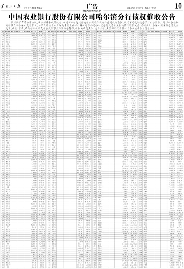 中国农业银行股份有限公司哈尔滨分行债权催收公告
