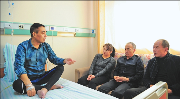 11月11日,身在病房的张文波同村干部交流工作。 本报记者荆天旭摄