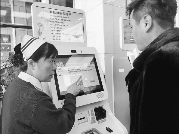 工作人员在自助挂号缴费机前为就诊患者提供咨询指导。