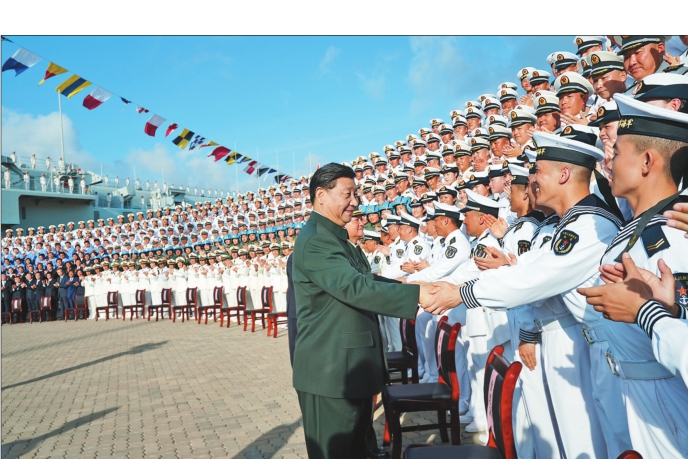 习近平向海军接舰部队授予军旗、命名证书。 新华社记者李刚摄