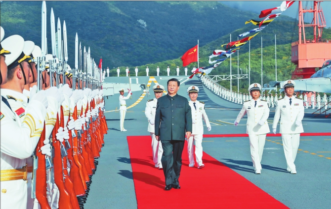 仪式结束后,习近平登上山东舰,检阅仪仗队。 新华社记者李刚摄