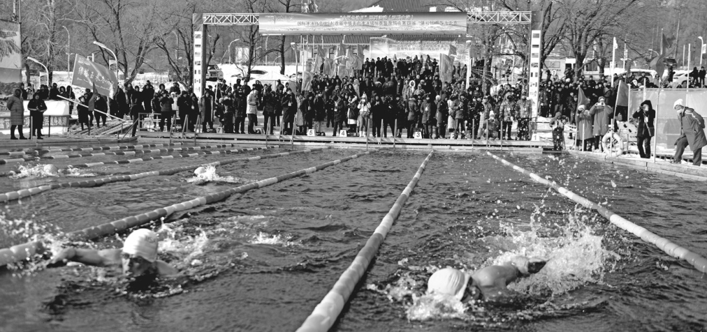 选手们在岭东区东湖冬泳训练基地冰泳赛道上“劈波斩浪”。