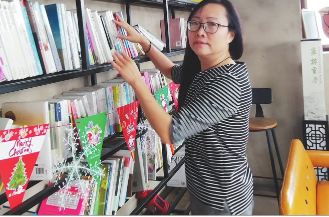 于璐向客人介绍森林书屋的藏书。 本报记者崔立东摄