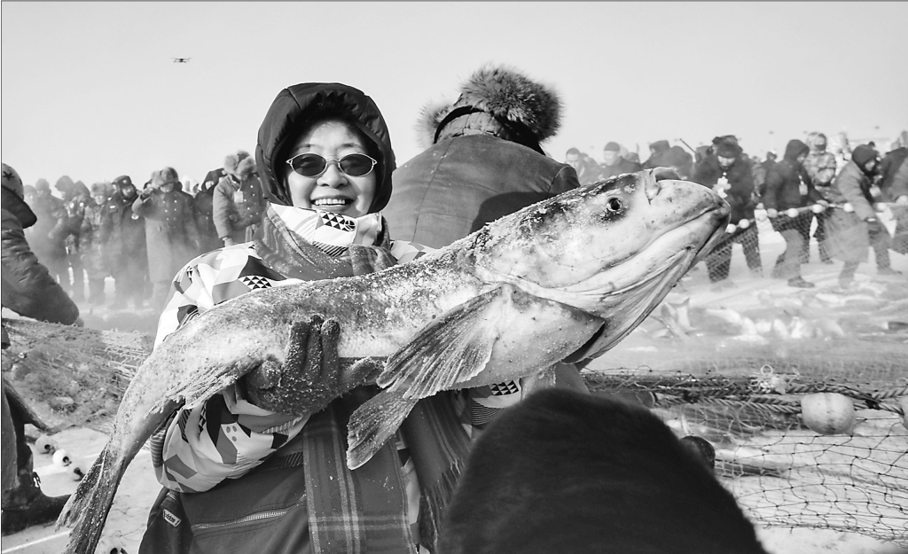 这是在杜尔伯特第二届冰雪那达慕大会上,游客捧起刚刚从连环湖中网捕出来一条二十多斤重的大鱼,兴奋地拍照留念。