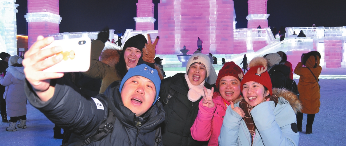 5日,哈尔滨冰雪节正式开幕。冰雪大世界内,中外游客纷至沓来,在美丽的冰灯雪塑前,大家尽情地玩乐、拍照,感受着迷人的北国风光。 本报记者苏强摄
