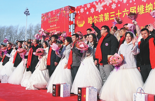 本报5日讯(记者李健)5日10时28分,哈尔滨第三十六届维纳斯公益冰雪集体婚礼在防洪纪念塔广场举行。43对新人伴随着悠扬的婚礼进行曲,牵手走过红毯,在千里冰封的松花江畔,在嘉宾亲朋的共同见证下,步上庄重喜庆的典礼台,许下爱的承诺。 本届冰雪集体婚礼以“纯洁冰雪,唯美爱情”为主题,由共青团哈尔滨市委员会联合市委宣传部、市文化广电和旅游局等7家单位共同主办。本届冰雪集体婚礼吸引了来自12个省1个直辖市30个城市的43对新婚和纪念婚夫妇的热情参与。 婚礼组委会为新人们准备了婚纱、化妆造型、手捧花、指环钻戒、乘坐车辆、典礼全程光碟、婚礼纪念品、新人喜宴、抽取幸运大奖、冰雪美景体验等十项免费服务环节。 据介绍,36年来,共有来自全球五大洲的1213对新婚和纪念婚佳侣,到哈尔滨体验冰雪情缘。 本报记者苏强摄