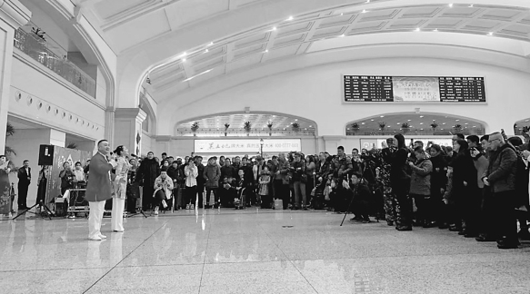 本报21日讯(记者董盈)新春佳节将至,21日,第九届“黑龙江之冬”国际文化艺术节省直文艺院团走进哈站系列演出——省龙江剧艺术中心第三场专场演出精彩上演。在哈尔滨火车站候车大厅里,省龙江剧艺术中心演职人员一行十余人,用喜庆欢乐的节目为旅客及车站工作人员送去新春祝福。 演出在二人转《小拜年》的热闹中火热开场,接着龙江剧《张飞审瓜》、歌曲《乌苏里船歌》、手绢绝活《看秧歌》相继登场,一展浓郁的东北地域风情;还有二胡独奏《赛马》、笛子独奏《嗨歌》令现场氛围不断升温;歌曲《领航新时代》《我爱你中国》,引起观众共鸣。精彩的演出让候车大厅化为音乐、掌声与欢乐的海洋,旅客们纷纷拿起手机记录、分享演出的精彩瞬间。