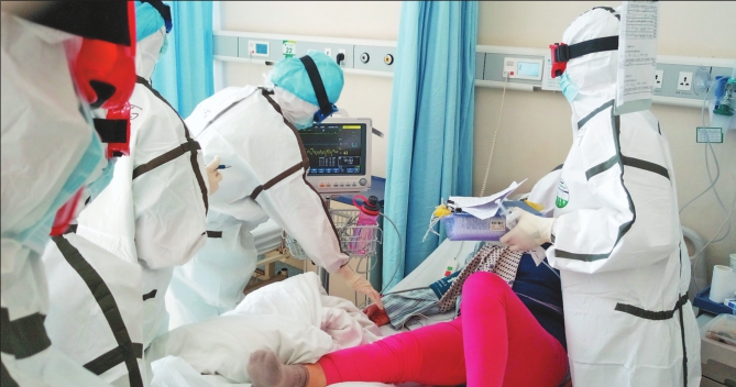 在武汉协和医院西院住院处的隔离区内,我省医护人员正在紧张地为患者治疗。 家宁本报记者郭俊峰摄