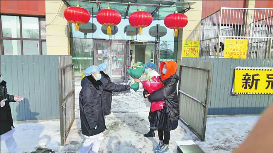 绥化市传染病医院医护人员为患者送上鲜花。 宋一枫张佳月本报记者程瑶摄