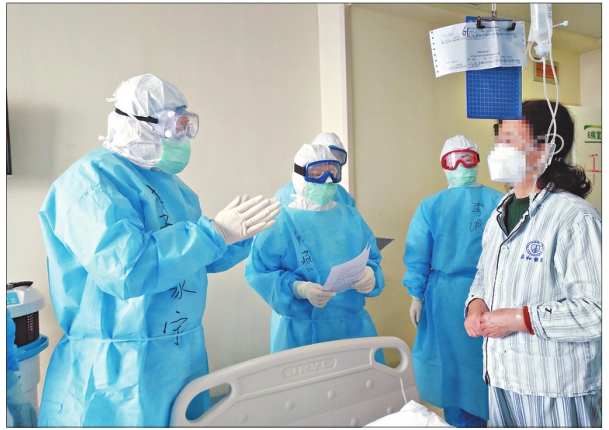 我省第一批援鄂医疗队按照国家治疗指南,结合当地实际情况摸索、建立的治疗“组套”,已经成为较为实用的救治“临床路径”。李家宁团队在隔离病房内正在对好转的患者进行检查。 本报记者郭俊峰摄