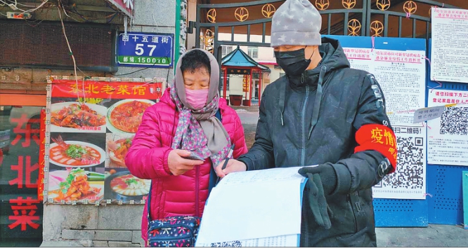 省国资委党委组织千名国企党员沉入社区战“疫”一线。这是党员杨林为外出小区居民登记。 本报记者孙佳薇摄
