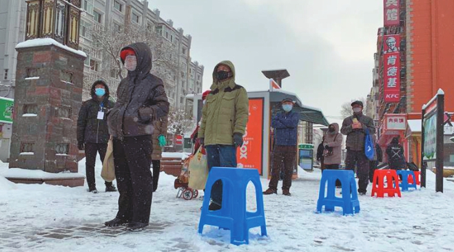 21日起哈尔滨连续降雪。在革新街、巴陵街街口,两家超市按时营业,采购的市民自动排起了长队。在导购员和市场监管人员的提示下,自觉保持安全距离,有序进入市场进行选购。 连日来,市场监管部门牵头,相关部门统一行动,指导监督各大超市、菜市场严格落实“管住门、分流人、快结算、强宣传、严管理、做承诺”规则要求,市民购物秩序井然,戴口罩、排队购物等文明行为蔚然成风。果戈里大街居民密度较大,恰逢周末,排队买菜的居民不断增多。市场监管工作人员在队伍边上,耐心提示顾客戴好口罩、快进快出,商家又细心地每隔两米摆放了小凳子,供顾客休息。 朱大治本报记者刘莉摄