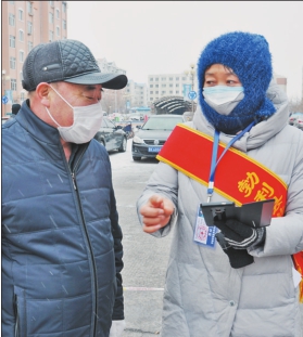 □黄晓慧本报记者文天心 “我们社区网格员孙秀玲大姐每天苦口婆心劝阻居民出门,热心帮助行动不便的居民买药买菜,走遍社区‘犄角旮旯’查找居民出行‘漏洞’,还要劝拾荒人员返家,她嗓子都喊哑了……”勃利县城西街道学府社区干部不断“爆料”。 孙秀玲是勃利县科学技术与信息产业局局长。2月14日,勃利县委选派科级干部为网格长,孙秀玲成为勃利县城西街道14位网格长中唯一的女性,她负责的“片区”是世纪新村,不但面积最大、人口最多,还出现过两例确诊病例,是重点防控小区。 “世纪新村小区共有55栋楼,4360户,10960人。”孙秀玲对小区情况了如指掌。孙秀玲不但和大家在卡口值守,每天还要在小区内走一遍,重点查看封堵边界地带有无“漏洞”。她在巡查中发现,沿河处有3处被居民扒开的“口子”。孙秀玲及时联系城西街道办事处,协调建设局进行及时修补。 “孙秀玲每天微信步数都是一万多步,她是居民贴心人,哪里有情况哪里就会出现她的身影。”学府社区委主任施红霞不无钦佩地说。 孙秀玲(右)为居民讲解如何使用手机扫码出入小区。 黄晓慧摄