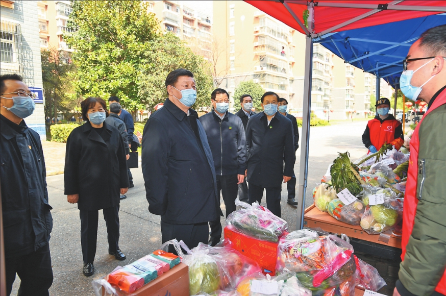 习近平在东湖新城社区生活物资集中配送点,详细询问社区群众生活物资采购和供应情况。新华社记者谢环驰摄