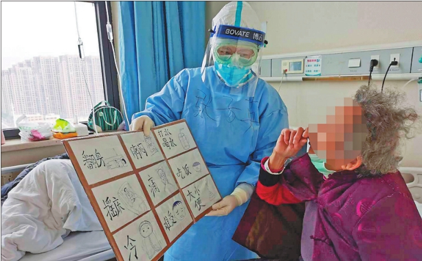 □本报记者朱彤 由齐齐哈尔医学院附属第一、第二、第三医院的118名医护人员组成(其中医生18名,护士100名),2020年2月2日晚抵达武汉的黑龙江省第二批支援武汉医疗队,2月4日正式进驻华中科技大学同济医学院附属协和医院西院开展诊疗工作。这段时间以来,他们与协和医院医护团队、中国医科大学医疗队、广东医疗队、内蒙古医疗队等密切配合,已阶段性较好地完成了国家卫健委的工作要求和各项诊疗任务,无一差错事故发生,广大患者反馈满意,也无一例队员感染发生。医疗队用精湛的技术,大疫当前无私奉献的协作精神,成为受援医院最强协作团队,也让一方有难、甘于奉献的“龙江精神”在抗击疫情的最前沿得到最好诠释。 2月4日医疗队正式进驻病区服从调遣,迅速进入多个战场。根据医院整体部署,医护团队先后投入到2楼ICU病区和6楼、14楼、13楼重症病区工作。护理团队先后有13名护士与广州医科大学钟南山医疗队配合,参与2楼重症医学科18名患者的救治;15名护士与中国医科大学医疗队配合,参与14楼45名患者的救治。现医护团队主要负责武汉协和医院西院6楼西侧病区重症患者救治工作,另分派33名护士到13楼东病区参与中国医科大学医疗队的诊疗工作。截至3月9日,医疗队整建制管理的6楼西病区,现有住院病人43人(其中重症29人、危重症1人、轻症13人),共收治86例,其中危重症22例,重症63例,治愈出院20例,由危重转为轻症移送到雷神山医院等继续接受治疗的患者共有6名;13楼东侧病区,配合中国医科大学医疗团队共计完成74名患者(其中重症65人)的护理工作。 医疗组逐一对在院患者治疗情况进行梳理,安排专人对三级医生查房方面进行病历质控,医师组分组管理病人,根据病情变化及时调整诊疗方案,积极开展救治工作。护理组除进行打针、发药、喂饭、生活护理等,勤与患者沟通交流、健康宣教。同时,医疗队还在各个服务病区倾情服务武汉病患。他们建立“齐汉守望‘疫’往情深”医患沟通群,引入心理咨询专家,主动为病人提供在线心理疏导服务;队员手绘“患者需求卡”,把平时出现频率较高的患者需求画成画,用真心细心守护患者健康;为给患者调节饮食增加营养,队员们还把自己收到的家乡慰问食品送给患者,对过生日的病人送上生日蛋糕。 张子英护士通过指示板和患者沟通交流。 本报记者郭俊峰摄