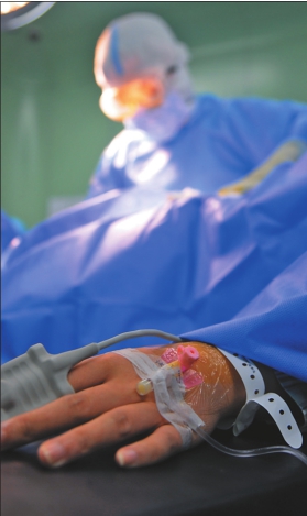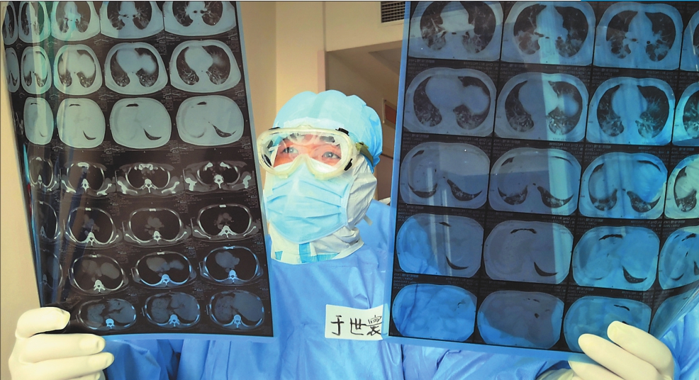 哈医大一院的于世寰在病房内查看患者的CT片子。