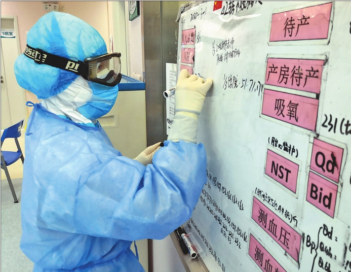 我省医疗队医护人员在武汉协和医院西院产科隔离病房留言板上标明日常注意事项。