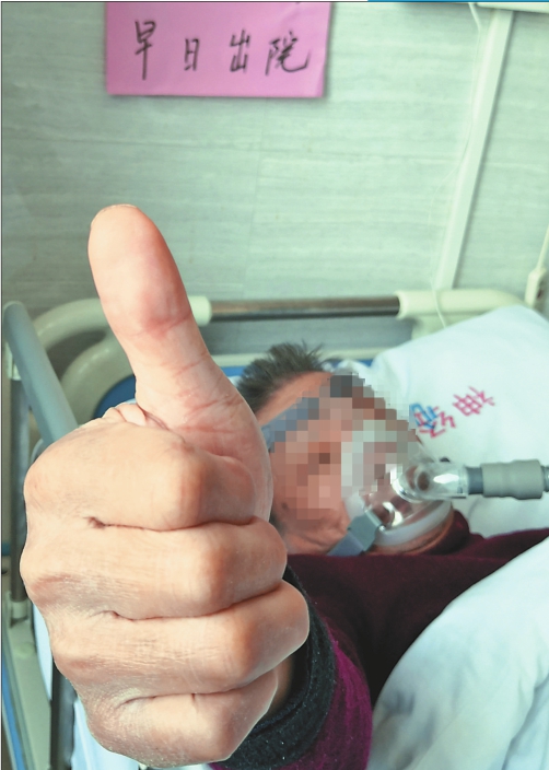 一名新冠肺炎患者在武汉第一医院隔离病房内有所好转,他向负责治疗他的黑龙江医生竖起大拇指。