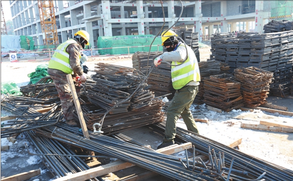 工人正在加紧进行钢筋绑扎处理。 本报记者姚建平摄