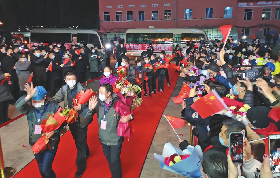 本报21日讯(记者王莹赵一诺)21日,我省支援孝感医疗队分乘4架“英雄号”航班,从12时开始,陆续飞往齐齐哈尔、牡丹江、佳木斯和哈尔滨。经停齐齐哈尔的班机接着飞往黑河,经停牡丹江的班机接着飞往伊春。 15时50分,搭载着191名我省支援孝感医疗队哈尔滨和绥化医疗队员的CZ5270航班抵达哈尔滨太平国际机场。省委常委、秘书长,省应对新冠肺炎疫情援鄂指挥部副总指挥张雨浦,副省长、省应对新冠肺炎疫情援鄂指挥部副总指挥孙东生到机场迎接。 当医疗队员走下舷梯时,机场警务共同敬礼,现场接机人员挥舞国旗高呼“欢迎回家!”医疗队员在热烈的气氛中接过鲜花,向家乡亲人们挥手并合影留念。 据悉,此次返程援鄂人员共638人,包括第六批第七批部分医务人员和省疾控中心派往恩施和武汉支援的工作人员。其中,我省支援孝感医疗队哈尔滨地区医疗队员,分别由黑龙江省医院、哈尔滨市第一医院、哈尔滨市第二医院等医院的呼吸科、重症医学科、外科医护人员组成。 在齐齐哈尔三家子机场,飞机刚刚出现在视野中,等待的人群便传来欢呼声,14时50分,我省支援孝感医疗队齐齐哈尔地区的80名医疗队员到家了,热烈的掌声、滴翠的鲜花,医疗队员们被家乡人民的热情包围。 (下转第三版) (上接第一版)15时10分,武汉飞往牡丹江包机徐徐降落,91名援鄂医疗队员顺利完成了在湖北武汉市、应城市等医院的救治任务,不负众望、胜利凯旋。 15时50分,156名佳木斯援鄂医疗队员乘坐包机飞抵佳木斯机场,当白衣勇士走出机舱时,“热烈欢迎白衣战士平安回佳、向最美逆行者致敬”等问候不绝于耳。 随后,70名黑河援鄂医疗队员和50名伊春援鄂医疗队员也相继乘坐包机抵达当地机场。 据悉,从2月12日起,我省分批次派出支援孝感医疗队医务人员和工作人员550人。医疗队管理患者1077人,治愈出院942人,按规定转院115人。我省医疗队医疗救治、心理干预、疾控流调等方面,均取得显著成效。