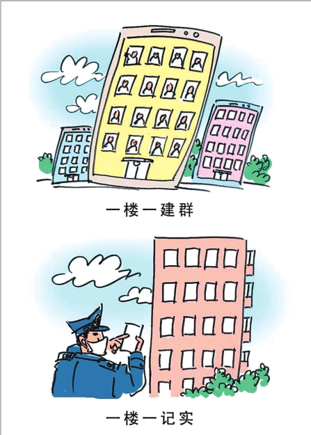 “一栋一建群”,以居民楼为单位建立小区微信群。“一楼一记实”,利用“839”系统记录每个单元楼走访记录。“一户一好友”,民警与小区居民互加微信好友。“一家一视频”,对入户走访的每家情况进行视频录像,并整理分类。“一人一标签”,在每一个居民微信好友备注标签里,填写入户走访档案。 王俊平画
