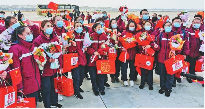 □文/摄本报记者姚建平 顶冬雪驰援武汉,迎春花凯旋而归。3月30日16时18分,满载着我省第二批援鄂医疗队119名队员的南航CZ5252航班在齐齐哈尔三家子机场顺利降落,抗疫勇士平安抵达家乡鹤城。经过58天的奋战,119名白衣战士克服困难,顽强与时间赛跑、与病毒斗争,用勇敢无畏书写历史,用责任担当镌刻人生精彩,用医者仁心的大爱,向党和人民交上了一份满意的答卷。 医疗队许多队员都说,为了抗疫的胜利,我们宁愿推迟回家,坚持到最终捷报的到来。没有一个冬天不能逾越,疫情终将被我们战胜。 在机场停机坪前,欢迎人群队伍打出“热烈欢迎龙江勇士凯旋”“热烈欢迎白衣战士平安回家”等横幅标语。当医疗队员走下舷梯时,身着制服的机场警务人员整齐地向胜利归来的医疗队员敬礼,机场工作人员向医疗队员献上鲜花。大家手执国旗高呼:“欢迎回家!”“欢庆凯旋!” 2月2日下午,由来自齐齐哈尔医学院附属第一、第二、第三医院的1名领队和118名医护人员组成的我省第二批援鄂医疗队从齐齐哈尔出发,出征武汉驰援防控疫情第一战场。医疗队领队由附属第三医院副院长武立刚担任。18名医生均为呼吸科、重症医学科骨干力量,100名护理人员来自重症医学科和其它科室的优秀护士。 医疗队进驻武汉后,整建制管理武汉协和医院6楼西病区,经过近2个月的奋战,我省第二批援鄂医疗队不辱使命,完成全部救治任务。医疗队累计收治新冠肺炎患者112例,其中危重症27例,重症84例,治愈出院81例。另外由危重转为轻症移送到雷神山医院等继续接受治疗的患者8人,转科6人。全体队员零感染,无一差错事故发生,受到患者广泛好评。 刚刚走下舷梯的我省第二批援助武汉抗疫医疗队医师组组长、齐齐哈尔医学院附属第二医院重症医学科主任、主任医师张东海对记者说,“医疗队员春节放弃休假,逆行千里驰援武汉,投身到抗疫一线。在救治一线,防护服里面是我们赤诚的心,防护服外面看到的是一双双渴望的眼,我们忘记了疲惫,全力以赴进行救治。走下飞机回到家乡的那一刻,一声声暖心问候,顿时让我泪目,激动喜悦的心情无以言表,置身在这盛大隆重的礼遇当中,在深感不安与幸福的同时,更加强烈感受到了党和国家对医务工作者的敬重、爱护和褒奖,赋予了我们这些普通医务工作者英雄的礼遇和荣光。为国家担责、为武汉拼命,为家乡争光,无憾!” 看到热烈的欢迎场面,齐齐哈尔医学院附属第一医院医疗队队长于洋激动地说:“还记得58天前,刚刚踏上武汉这片土地,感受到一个千万人口城市的沉寂,静的让人心痛,让人恐惧。我们英勇的队员克服了内心的不安和种种的困难,全面接管危重症病区,肩负起抗疫的担当和重任。我们每一名队员都在做着普普通通的工作,怀着一腔热血与赤子之心,把白衣天使的誓言带到了前线。这份荣誉既珍贵又难忘,会时刻激励完成自己的誓言。” 前不久刚刚获得全国卫生健康系统新冠肺炎疫情防控工作先进个人的医疗队护理组组长、齐齐哈尔医学院附属第二医院重症医学科护士长、副主任护师颜红霞对记者说,“支援武汉58天了,真的不敢相信时间过得这么快。我们医护人员日夜奋战,每一天都上演着与死神殊死搏斗的感人故事,越来越多的患者康复出院,这是白衣天使们用生命守护生命换来的。每每思此便眼眶湿润,心中澎湃万千。回到家乡的故土,看到家乡人民夹道欢迎,内心感到无比的激动喜悦,这一次抗疫经历终生难忘。只有强大的中国,才会有这样的壮举,只有中国医护,才会有这样的胸怀。” 正在与队友合影的齐齐哈尔医学院附属第三医院重症医学科护士齐姗姗说:“我虽然在ICU工作10余年,但是在救治前线太多复杂情况等待着我们。因为班次特殊,导致我们很多人都患有严重的失眠,睡不好休息不好,但大家都无怨无悔。工作一周后,陆续有患者出院,当听见患者出院真诚感谢的话语,觉得再难再累都值得了。此次出征援助武汉,让我更加深刻理解了责任与使命的含义,没有大家就没有小家的意义。这么多医务人员驰援武汉,万众一心,众志成城,对很多人精神上都是一次洗礼,让我们深深体会到伟大祖国强大的凝聚力。作为医护人员,为祖国人民身体健康奉献自己的力量,责任所在,义不容辞。”