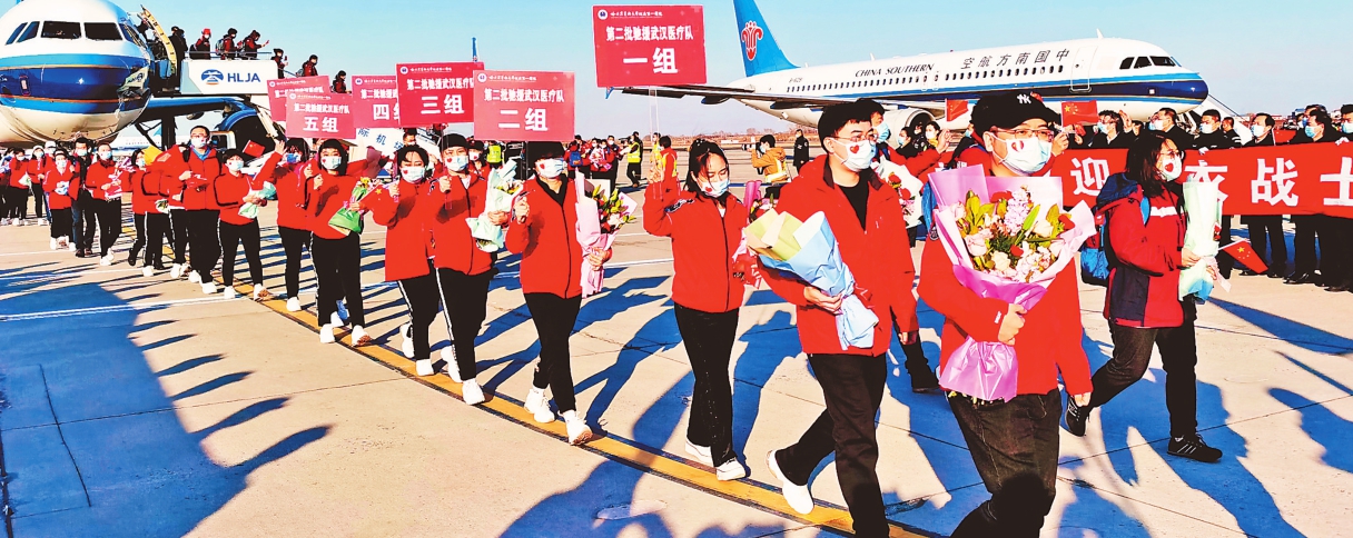 本报3月31日讯(记者曹忠义)3月31日下午,我省支援湖北省的第一批、第四批最后两批医疗队光荣完成医疗救治任务,从武汉乘坐包机飞抵哈尔滨,这标志着党中央交给黑龙江的支援湖北医疗救治工作这项重大政治任务圆满完成。省委书记、省人大常委会主任、省应对新型冠状病毒感染肺炎疫情工作领导小组组长张庆伟,省委副书记、省援鄂指挥部总指挥陈海波到机场迎接。 下午4时许,载着454名援鄂医疗队队员的三架包机陆续降落在哈尔滨太平国际机场。停机坪上,鲜艳的五星红旗迎风飘扬,接机代表洋溢着热情的笑容,“热烈祝贺黑龙江支援湖北医疗救治工作圆满完成”“热烈欢迎龙江勇士凯旋”“热烈欢迎白衣战士平安回家”等横幅标语格外醒目。医疗队员们精神饱满、洋溢着胜利的喜悦走出机舱,在停机坪上列队集结,现场响起热烈掌声和“欢迎回家”“欢庆凯旋”的欢呼声。 在听取第一批援鄂医疗队领队焦军东、第四批援鄂医疗队领队赵长久报告援鄂工作完成情况后,张庆伟代表省委省政府和全省人民热烈欢迎大家平安凯旋,向全体援鄂医疗队员表示崇高敬意和衷心感谢,并向他们的家属表示亲切慰问。他说,按照党中央统一部署,自1月27日我省第一批援鄂医疗队出征以来,全省共派出8批1554名队员驰援湖北省武汉市和孝感市。在60多个日日夜夜里,黑龙江省援鄂医疗队不负重托、不辱使命,帮助数以千计新冠肺炎患者恢复健康,打了一场十分漂亮的胜仗。特别是这次凯旋的第一批援鄂医疗队是我省连续战斗时间最长、治疗患者最多的医疗队;第四批援鄂医疗队在完成整建制接管武汉市第一医院两个重症病区救治任务后,又转战武汉大学人民医院继续战斗,创造了零病亡的医疗奇迹,龙江人民以你们为骄傲和榜样。全体医疗队员在祖国和人民最需要的时候,积极响应党中央和习近平总书记号召,主动请战、义无反顾、逆行出征,共产党员冲锋在前,战斗在重症救治最前线,彰显了无畏艰险、冲锋在前的担当精神。全体医疗队员在同时间赛跑、与病魔较量的过程中,吃苦流汗、日夜奋战,为打赢湖北保卫战、武汉保卫战立下了卓越战功,彰显了吃苦耐劳、忘我工作的奉献精神。全体医疗队员把个人安危置之度外,不放弃每一位患者生的希望,以龙江人特有的豪情激发了患者战胜病魔的信心和斗志,以精湛医术挽救了众多危重患者生命,展现了龙江医务工作者的无疆大爱,彰显了医者仁心、救死扶伤的职业精神。全体医疗队员从踏上荆楚大地的第一天起,就与湖北人民风雨同舟、守望相助,传递着龙鄂一家亲的深情厚谊,彰显了众志成城、共克时艰的互助精神。没有一个冬天不会过去,没有一个春天不会来临,正是因为有白衣天使的坚守,这个春天才更加美丽、更加绚丽。你们是最美的逆行勇士!你们是神圣的白衣天使!你们是龙江的时代楷模! 张庆伟强调,当前全省上下正在以习近平同志为核心的党中央坚强领导下,慎终如始,统筹推进疫情防控和经济社会发展。大家回来后要安心休整、好好休息,消除身心疲劳,以良好的精神状态和饱满的工作热情投入到今后工作中,为夺取疫情防控和经济社会发展双胜利作出新的贡献。各地各部门要全力做好服务保障工作,让英雄们享有最高礼遇、享受最好待遇,把关心关爱医务人员的政策逐人逐项落实到位,广泛宣传援鄂医疗队的先进事迹,在全省营造尊崇英雄、学习英雄的浓厚氛围。 仪式结束后,伴随着《我和我的祖国》优美旋律,医疗队员们陆续登车。张庆伟等向他们挥手致意,目送凯旋英雄离开机场。 张雨浦、陈安丽、聂云凌及有关部门负责同志参加活动,孙东生主持。