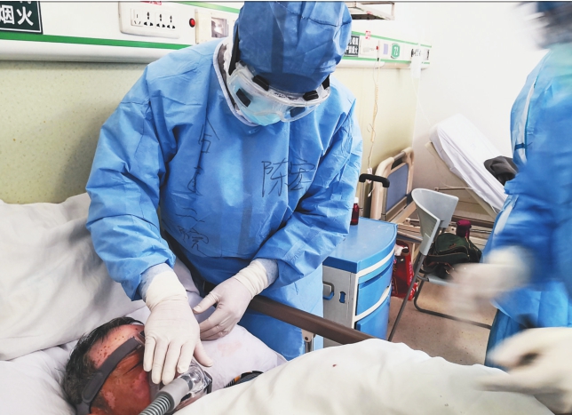 哈医大二院的陈宏在武汉第一医院救治一名危重患者。本报记者郭俊峰摄