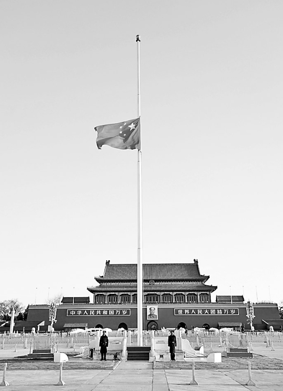 4月4日,北京天安门广场降下半旗,表达对抗击新冠肺炎疫情斗争牺牲烈士和逝世同胞的深切哀悼。 新华社记者鞠焕宗摄