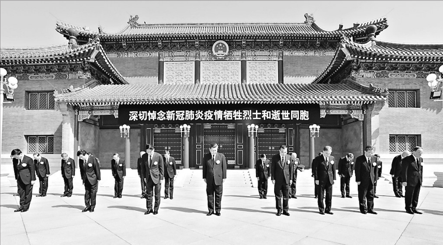 4月4日上午10时,习近平、李克强、栗战书、汪洋、王沪宁、赵乐际、韩正、王岐山等党和国家领导人在中南海怀仁堂前,同全国各地各族人民一起,向抗击新冠肺炎疫情斗争牺牲烈士和逝世同胞默哀。 新华社记者李学仁摄
