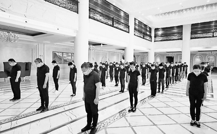 4日上午10时,黑龙江省第一批和第六批援鄂医疗队在各自的医学隔离点举行默哀活动,队员们或走上阳台,或在酒店大厅里,面朝武汉方向,默哀三分钟。
