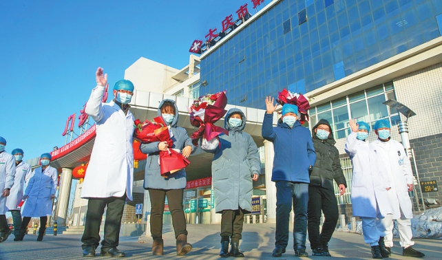 □文/摄赵龙本报记者李飞 3月21日0-24时,大庆市无新增新冠肺炎确诊病例,无新增疑似病例,最后一名新冠肺炎确诊患者治愈出院。至此,大庆新冠肺炎确诊病例清零。消息传来,大庆320万市民的目光不约而同聚焦在大庆市抗疫主战场大庆市第二医院。 62天,13个节点,见证了大庆市第二医院白衣战士和多家医院支援专家用精湛医术一次次挽救患者于生死之间的瞬间—— 1月20日,大庆市第二医院拉响战“疫”防控警报。作为大庆唯一一家传染病医院,承载着全市人民的重托和期望,大庆市第二医院全面应战。1月26日,医院开始腾空门诊楼所有病区,将4层楼改造为发热门诊、留观病房、隔离病房、ICU病房,腾空住院一部作为留观病房,集中收治新冠肺炎确诊病例。 1月27日凌晨,医院收治第一例新冠肺炎确诊病例。写病历、下医嘱、监测指标、对症用药……白衣天使一夜无眠。1月30日,一名患者血氧饱和度突降,呼吸急促,情况危急。白衣天使和重症专家实施气管插管、辅助机械通气,从死神手中抢回患者的生命。 2月8日,来自油田总医院、龙南医院、市人民医院的18名白衣战士完成200小时救治任务后,走出大庆市第二医院隔离病房。2月9日,大庆市在全省率先成立新冠肺炎疫情定点医院救治中心,组建救治指挥部,设在大庆市第二医院。来自油田总医院、龙南医院、市人民医院、市第三医院、市第四医院、市中医医院的专家与市第二医院全体医护人员组成救治团队。 2月13日,大庆市首例新冠肺炎治愈患者走出隔离病房。2月15日,ICU病房一名老年重症患者痰液多且粘稠,几次窒息。上ECMO(人工肺)等生命支持技术的同时,重症专家用支气管镜深部吸痰清理呼吸道,患者转危为安。2月18日,3名新冠肺炎治愈患者同时出院。2月20日,全市首例被治愈重症患者出院。2月26日,大庆市新冠肺炎治愈患者已超半数(14例)。 3月3日,4名新冠肺炎康复者自愿捐献血浆,其中3人符合捐献条件并成功捐献1000毫升恢复期血浆,用自己的“热血”帮助更多患者拥抱“春天”。 3月21日,大庆市最后一名新冠肺炎患者治愈出院。 “住院期间,市第二医院领导和医护人员不辞辛苦、日夜守护、精心治疗,真的非常感谢他们。”一名又一名患者手捧鲜花,挥手告别这个给了他们“第二次生命”的地方。或许,一声“再见”后,他们和这里永远不会再见面。或许,疫情过后,大庆市第二医院会宁静如常。但这里曾经的惊心动魄的回忆,白衣天使和患者们不会忘记,320万大庆人不会忘记。